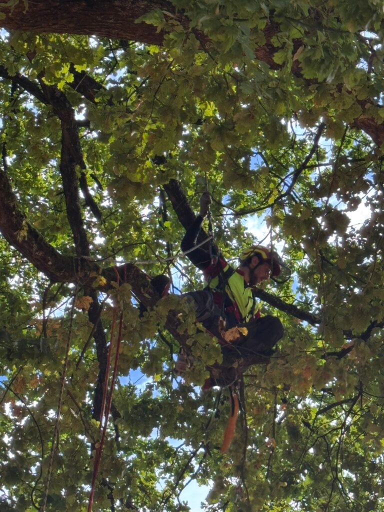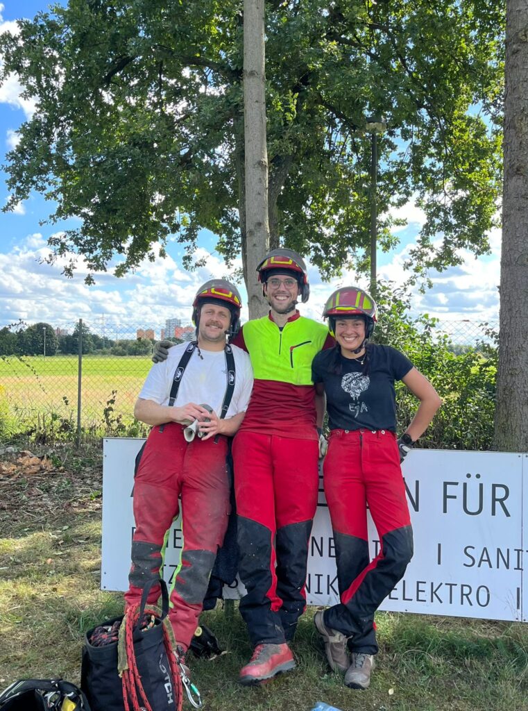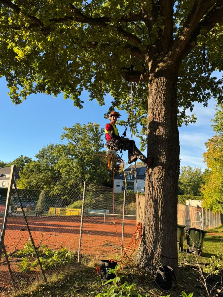 Ein paar Tage später stand bereits der nächste Einsatz im Rahmen des Sommerprojekts an. Am 03.09.2025 wurde die große Eiche am Platz 2 des TC Rot-Weiß Erlangen von Totholz befreit. Durch die Maßnahme konnte die Verkehrssicherheit des Baumes wiederhergestellt und ein sicheres Spielen gewährleistet werden. Unterstützt wurde die Aktion von Platzwartin Claudia von Lindeiner-Lang, die vor Ort half und die Organisation übernahm.