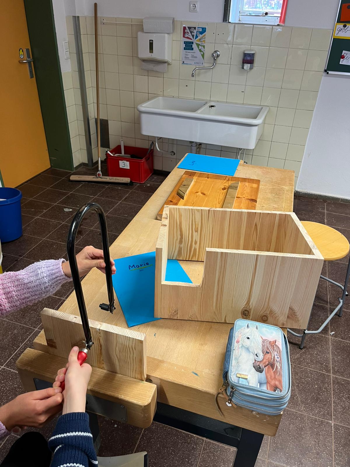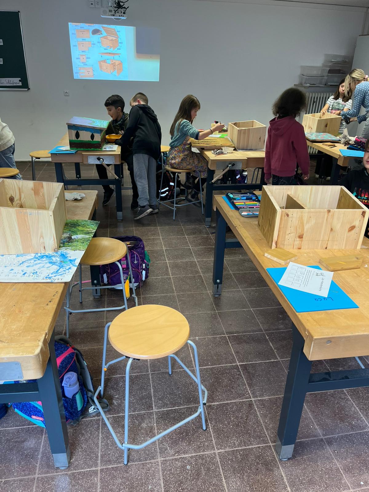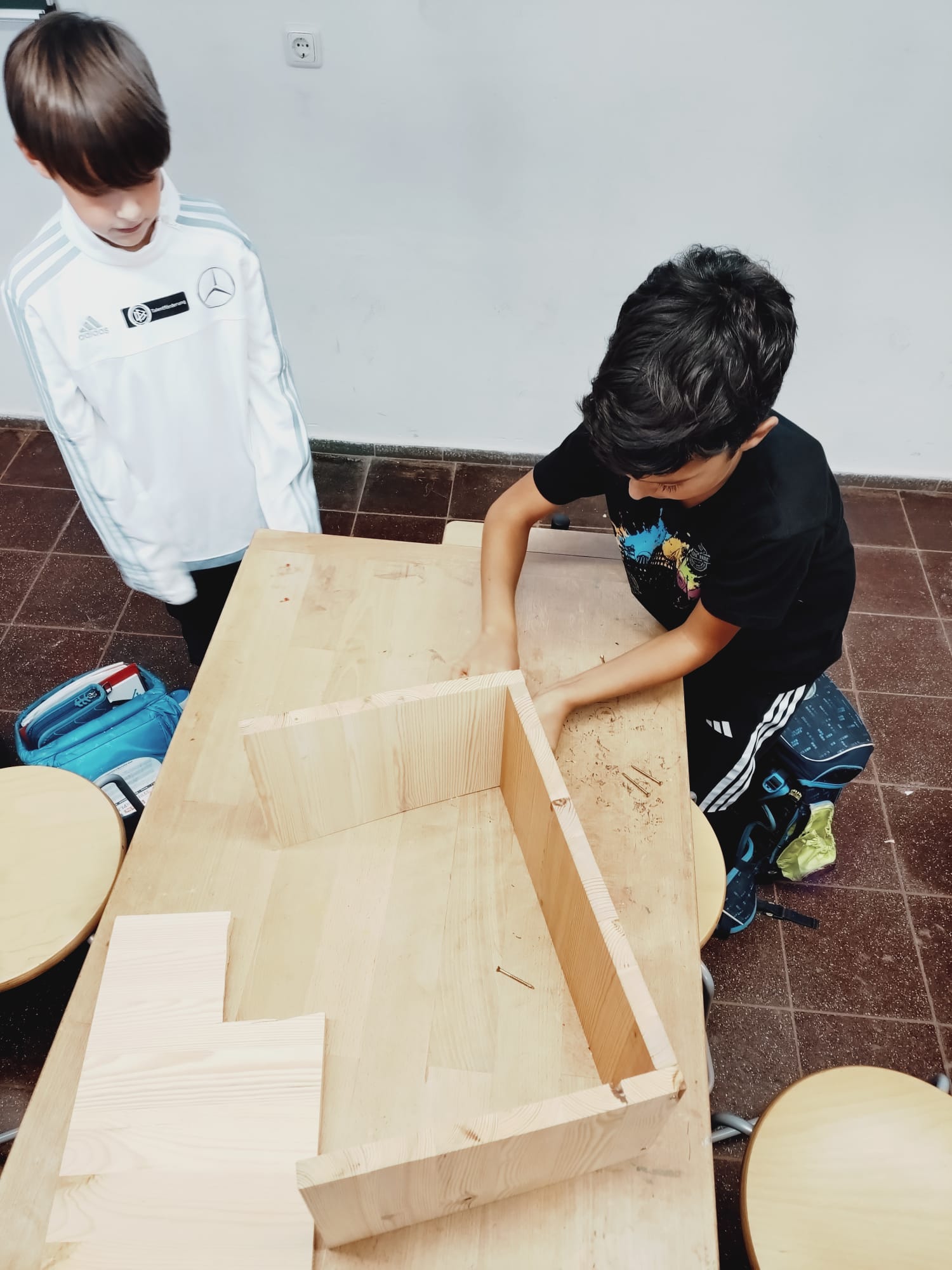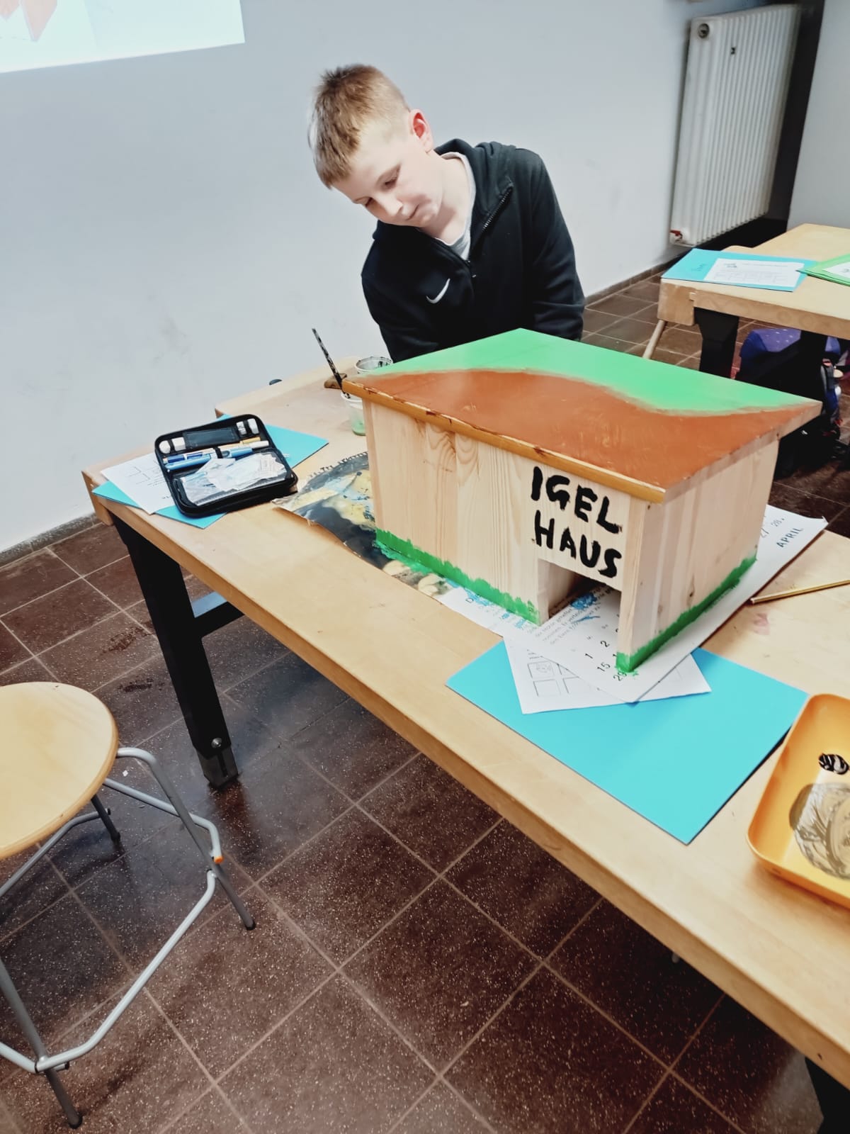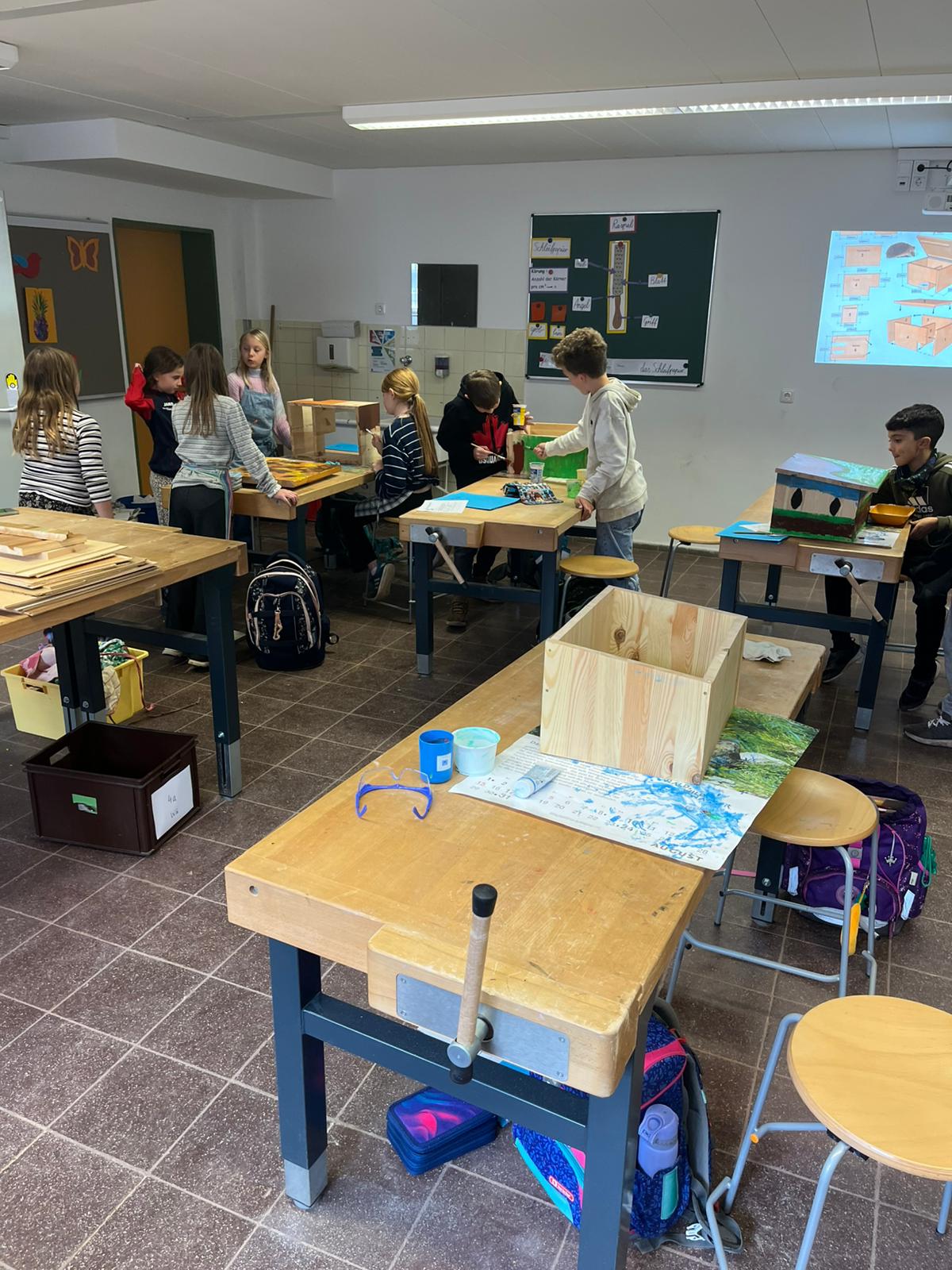 Der eigentliche Bau der Igelhäuser fand anschließend im Werkunterricht der vierten Klasse an der Grundschule Frauenaurach statt. Über zwei Wochen hinweg wurde jeweils in zwei Doppelstunden an den Projekten gearbeitet. Ich habe aktiv am Werkunterricht teilgenommen, eigenes Werkzeug mitgebracht und die Kinder während des gesamten Bauprozesses unterstützt und begleitet.