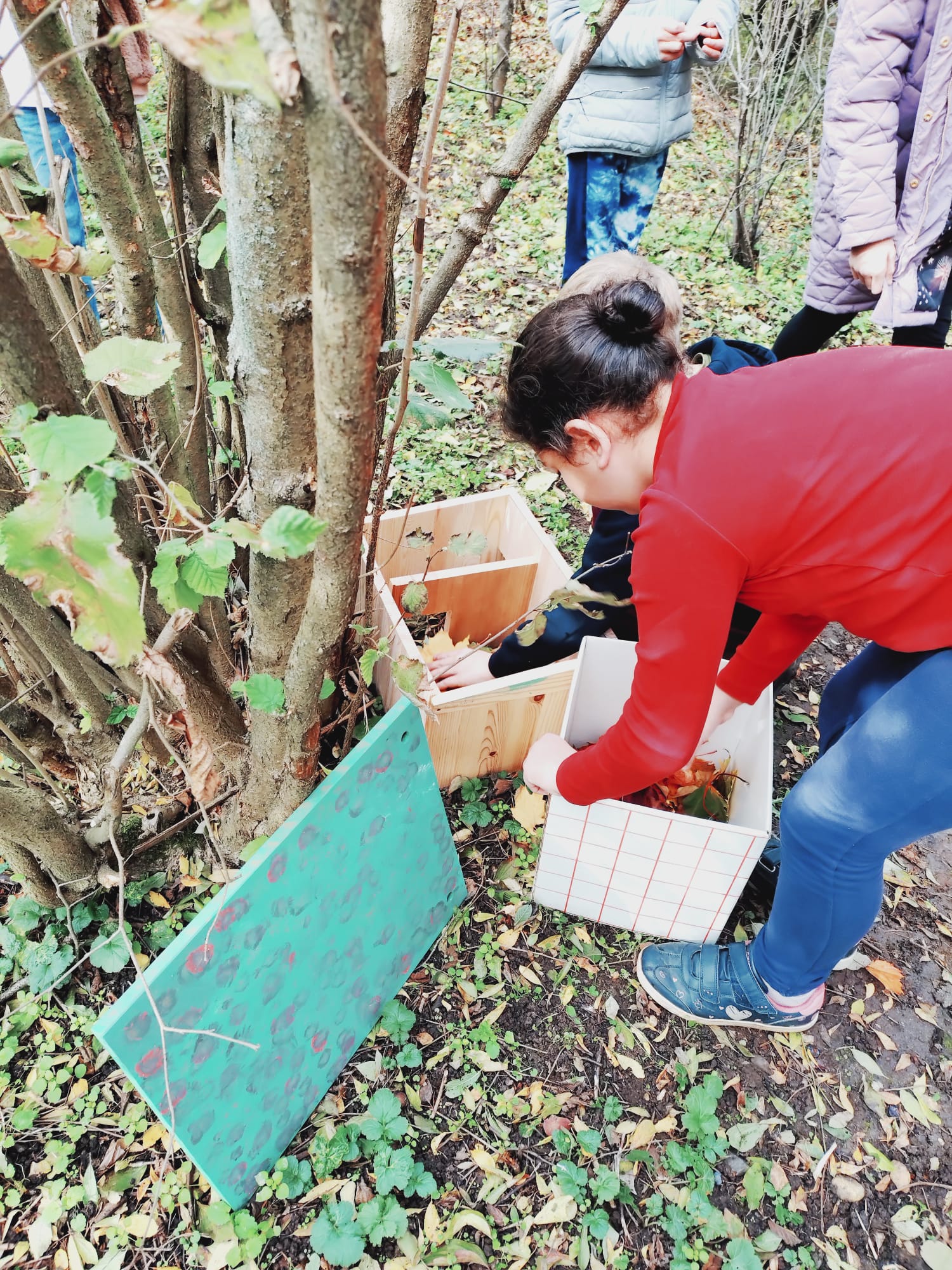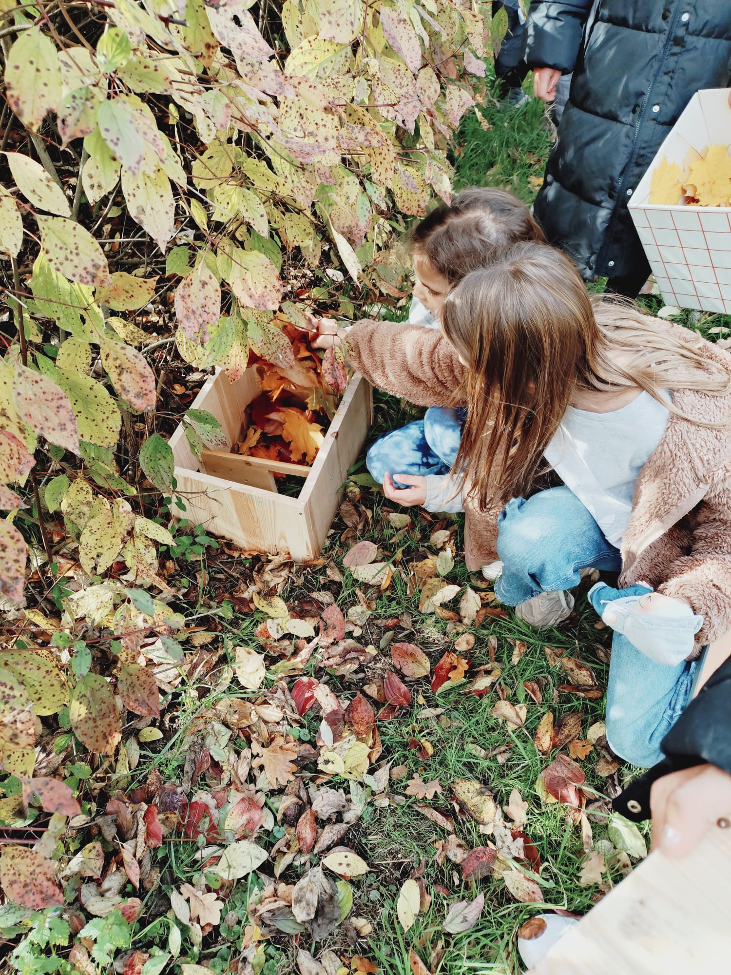 In der dritten Woche sammelten die Kinder das Material für das Innenleben der Igelhäuser. Verwendet wurden ausschließlich trockenes Laub und Moos, damit die Häuser gut isoliert und gleichzeitig trocken bleiben. Ein Teil der fertigen Igelhäuser wurde anschließend direkt auf dem Schulgelände aufgestellt, sodass dort neue geschützte Rückzugsorte für Igel entstanden sind.